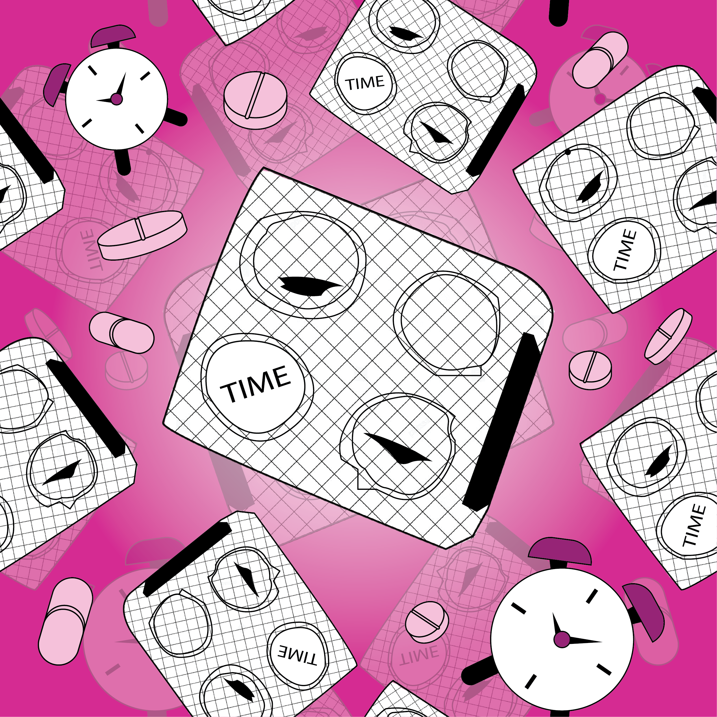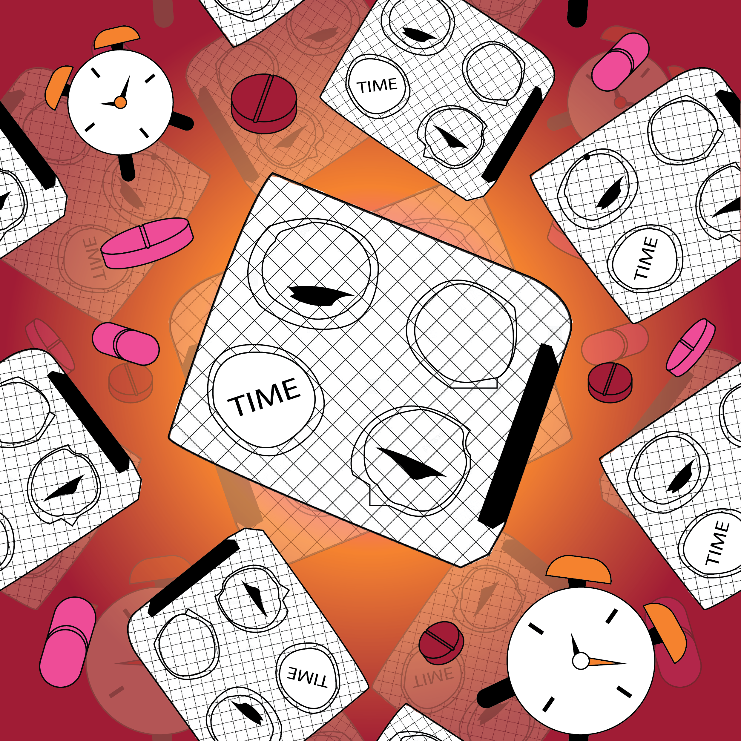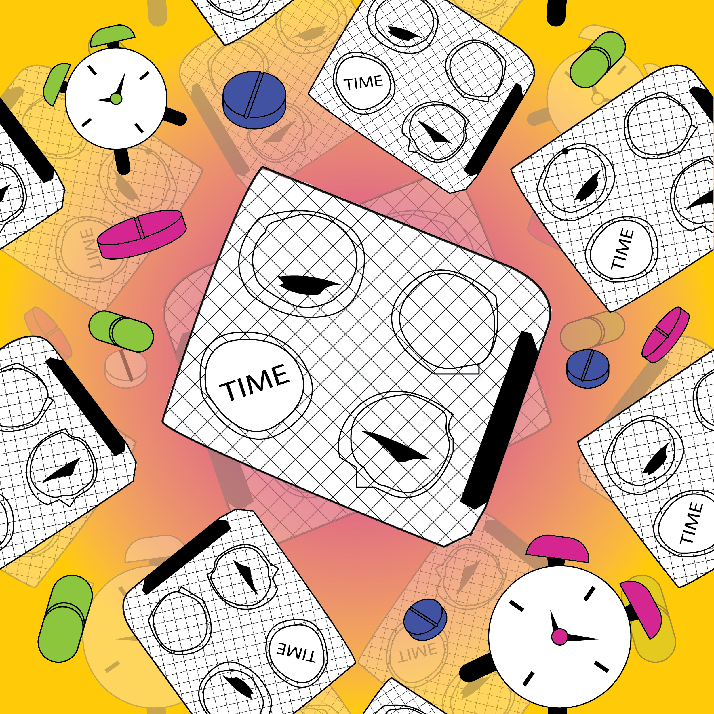 The design was applied onto a pill bottle mock-up—an intentional choice to parallel ideas of dosage, countdown, and the pressure of limited time. Just as medication is consumed in controlled intervals, the looping pattern around the bottle suggests routine and anxiety, turning a functional object into a metaphor for urgency. Throughout the process, I experimented with all six colour harmony systems to examine how mood, tension, and emotional intensity shift through colour.