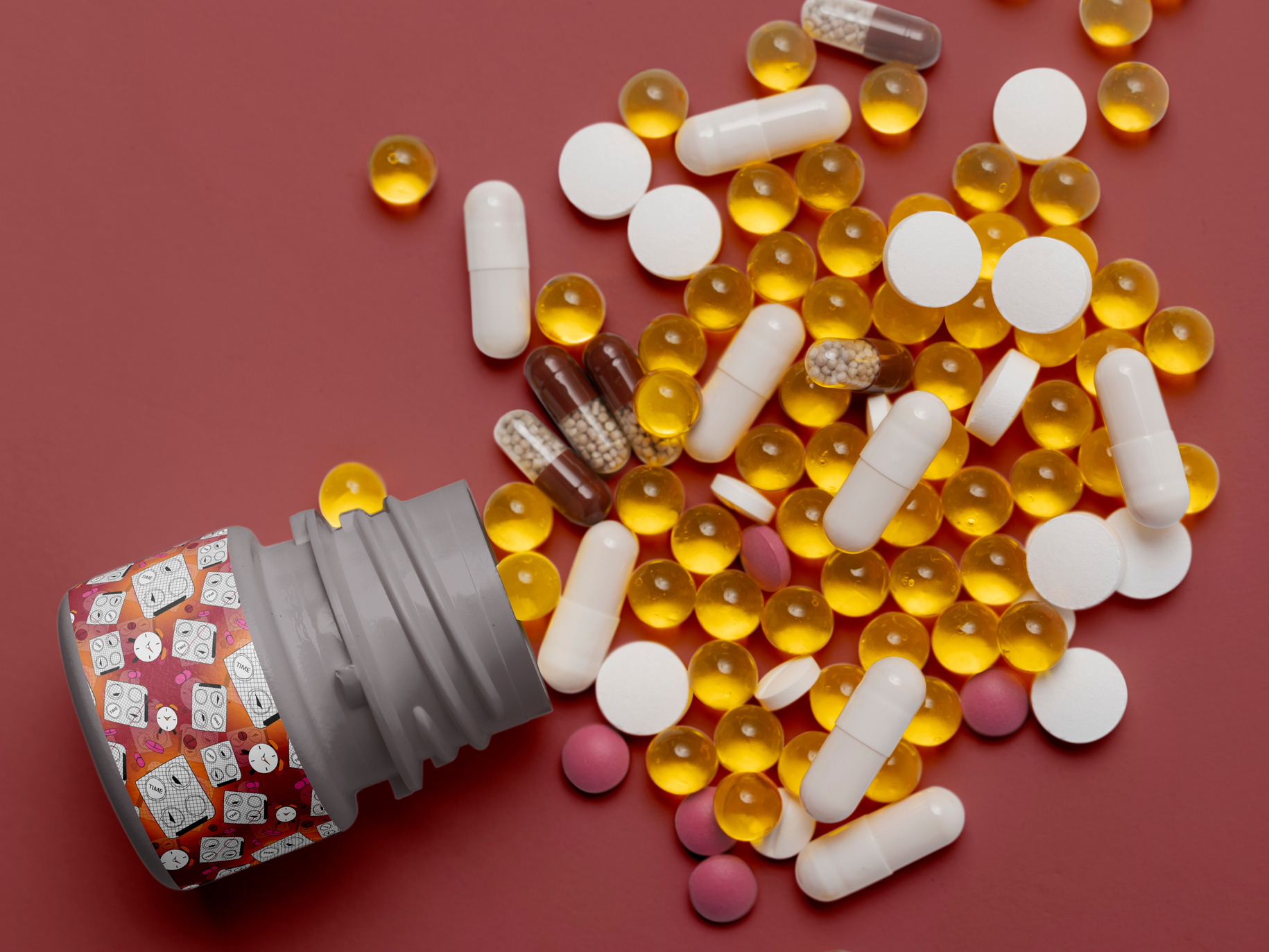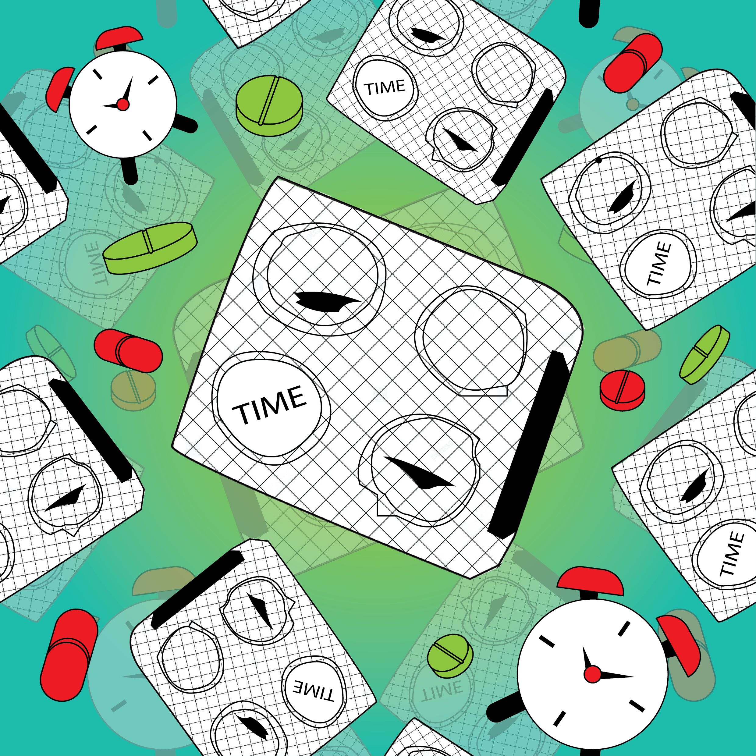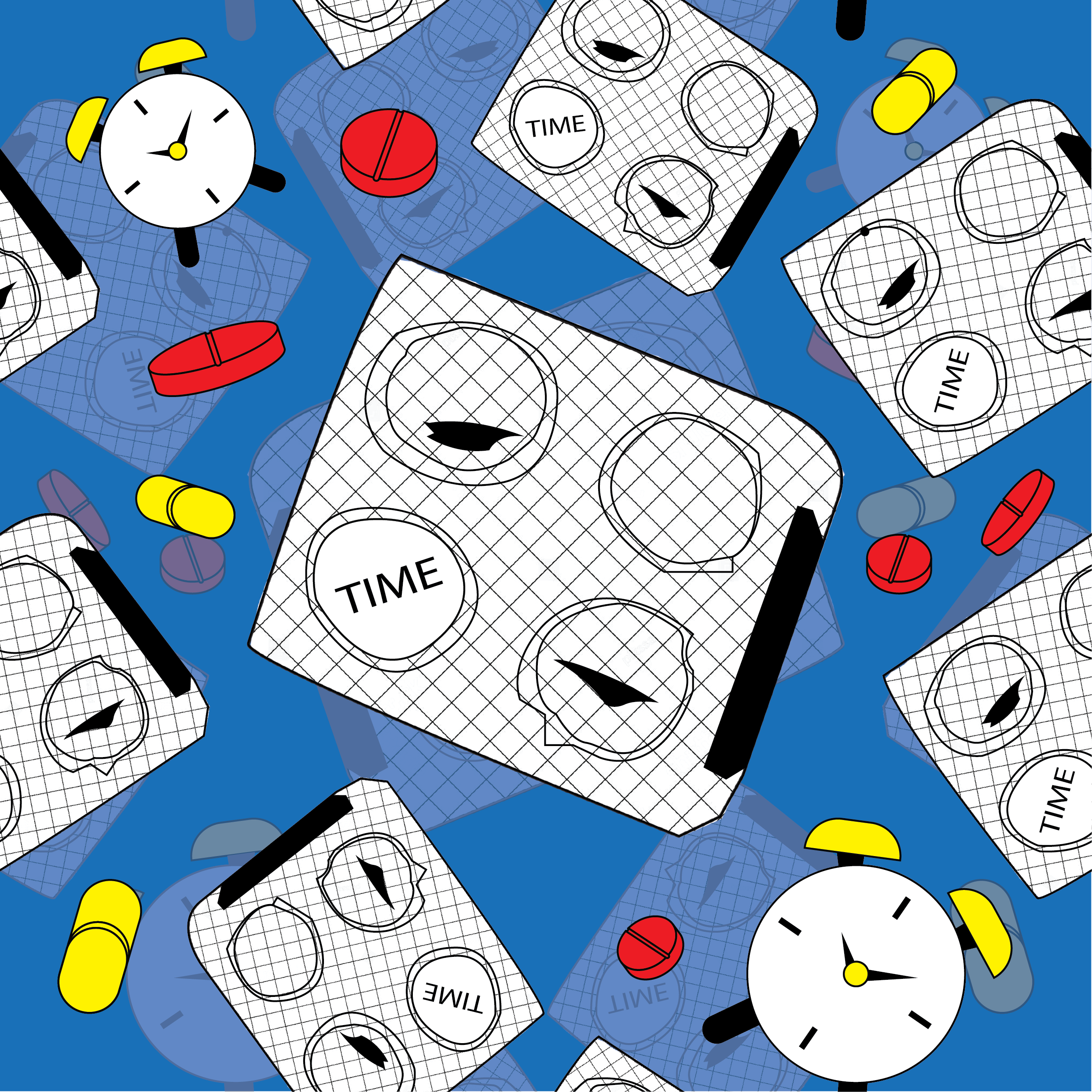The design was applied onto a pill bottle mock-up—an intentional choice to parallel ideas of dosage, countdown, and the pressure of limited time. Just as medication is consumed in controlled intervals, the looping pattern around the bottle suggests routine and anxiety, turning a functional object into a metaphor for urgency. Throughout the process, I experimented with all six colour harmony systems to examine how mood, tension, and emotional intensity shift through colour.